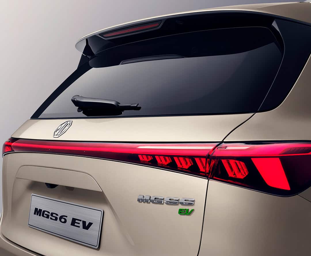 Fronten på MGS6 EV har et moderne, teknisk udtryk, der passer perfekt til en helt ny, elektrisk SUV. Den byder på en delt frontgrill inspireret af MG Cyberster, integrerede nær- og fjernlys samt en ny signatur for kørelys. Det ikoniske MG-emblem er placeret centralt og udført i en poleret sølvfinish.